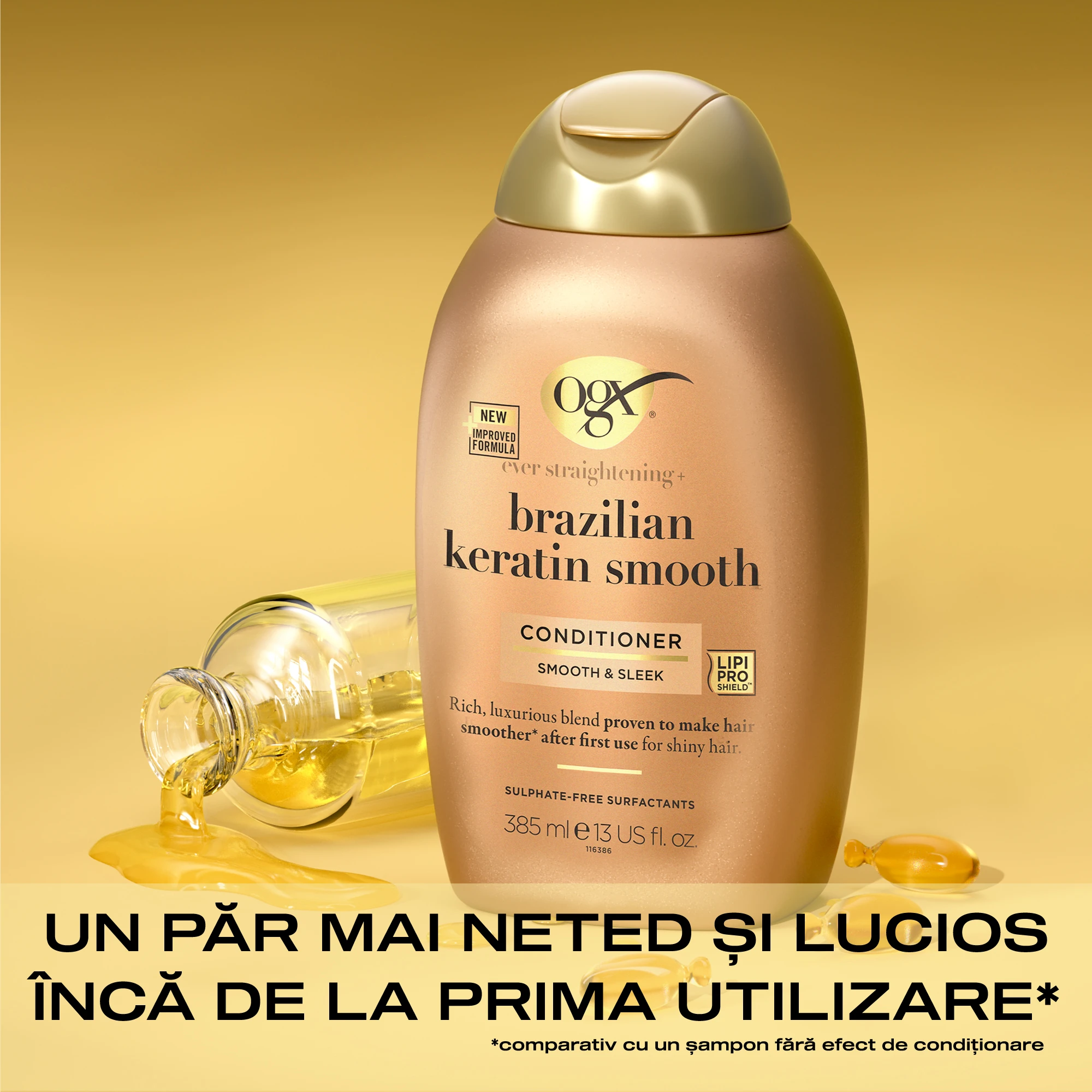 Redă frumusețea naturală a părului cu șamponul OGX® Ever-Straightening + Brazilian Keratin Therapy. Indiferent de tipul de păr, acest balsam puternic de netezire a părului hrănește și hidratează firele de păr, lăsându-le extra-lucioase și strălucitoare. Amestecul bogat și exclusiv al acestui balsam conține proteine din keratină braziliană, cunoscute pentru capacitatea lor de a întări și a netezi părul. Noua formulă a balsamului OGX, cu OGX Lipi Pro Shield™, se mândrește cu o formulă bogată în lipide nutritive și agenți hidratanți atent selectați, care respectă bariera lipidică și proteică, pentru un păr puternic, frumos și sănătos.