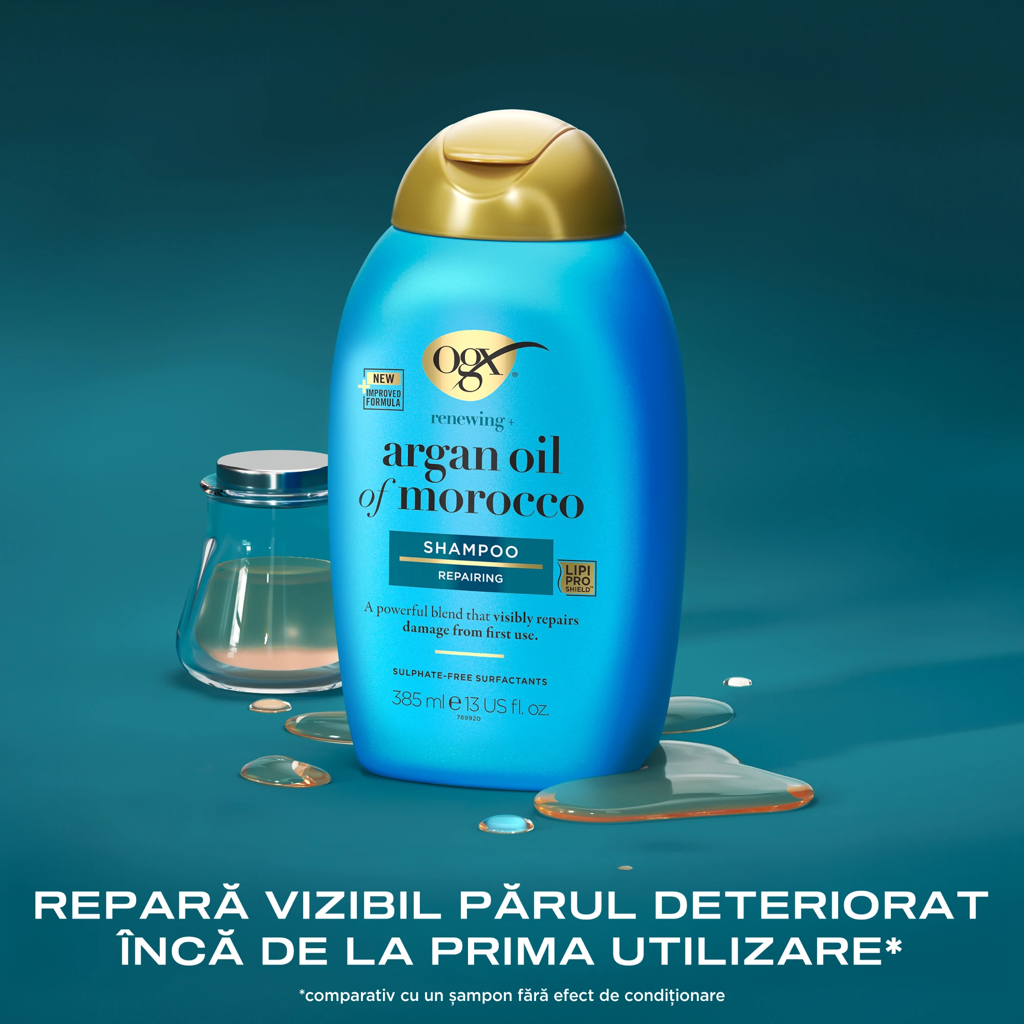 Repară și întărește părul uscat și deteriorat cu șamponul OGX Renewing + Argan Oil of Morocco. Șampon Argan Oil of Morocco de la marca numărul 1 în repararea părului din SUA*. Formula noastră nouă și îmbunătățită protejează părul împotriva pierderii excesive de lipide și proteine, care provoacă electrizare și rupere. Acum, cu tehnologia Lipi Pro Shield™, șamponul oferă de 2 ori mai multă protecție cu proteine și lipide** pentru un păr mai sănătos .