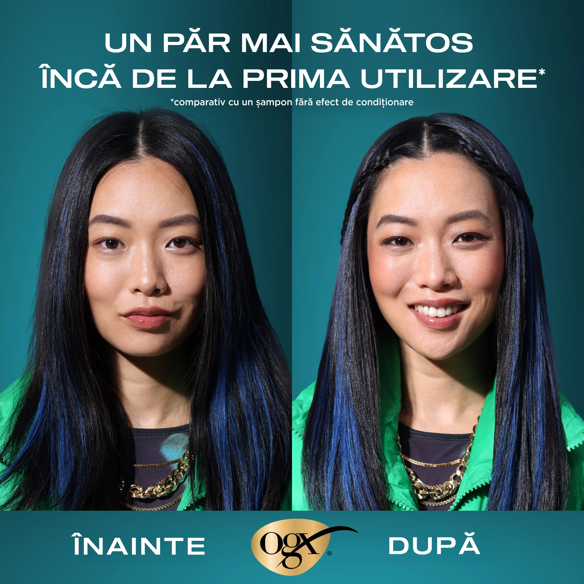 Aplică pe părul ud, masează până face spumă, clătește și apoi aplică un balsamul OGX. Acesta a fost formulat cu grijă pentru a nu conține agenți tensioactivi sulfați.